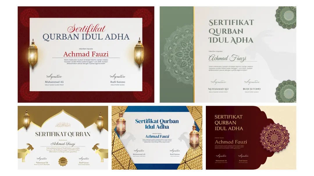 5 desain, 1 template sertifikat digital untuk peserta qurban.