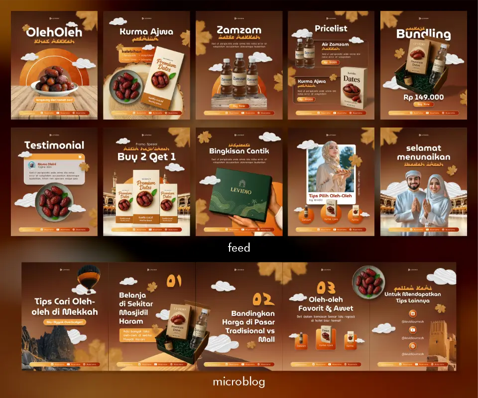 180 desain, 12 template feed dan story Islami siap edit untuk kebutuhan promosi travel Umroh.