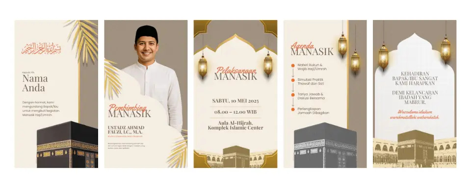 3 desain, 15 template undangan untuk acara manasik dengan nuansa Islami.