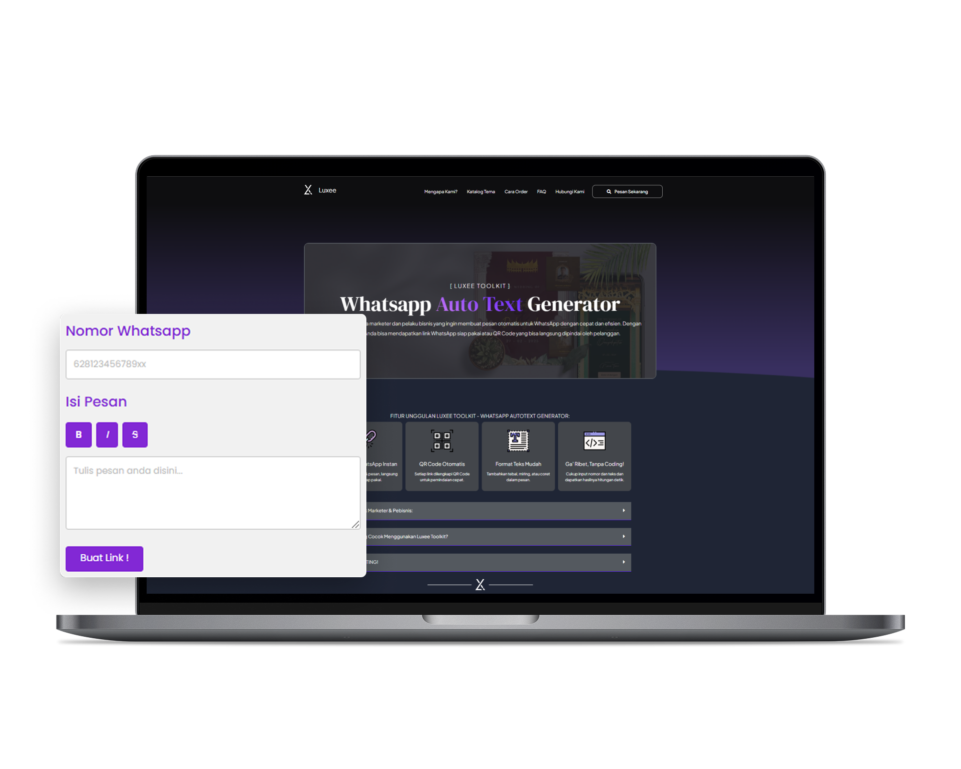 Alat praktis bagi para marketer dan pelaku bisnis yang ingin membuat pesan otomatis untuk WhatsApp dengan cepat dan efisien. Dengan sekali klik, Anda bisa mendapatkan link WhatsApp siap pakai atau QR Code yang bisa langsung dipindai oleh pelanggan.
