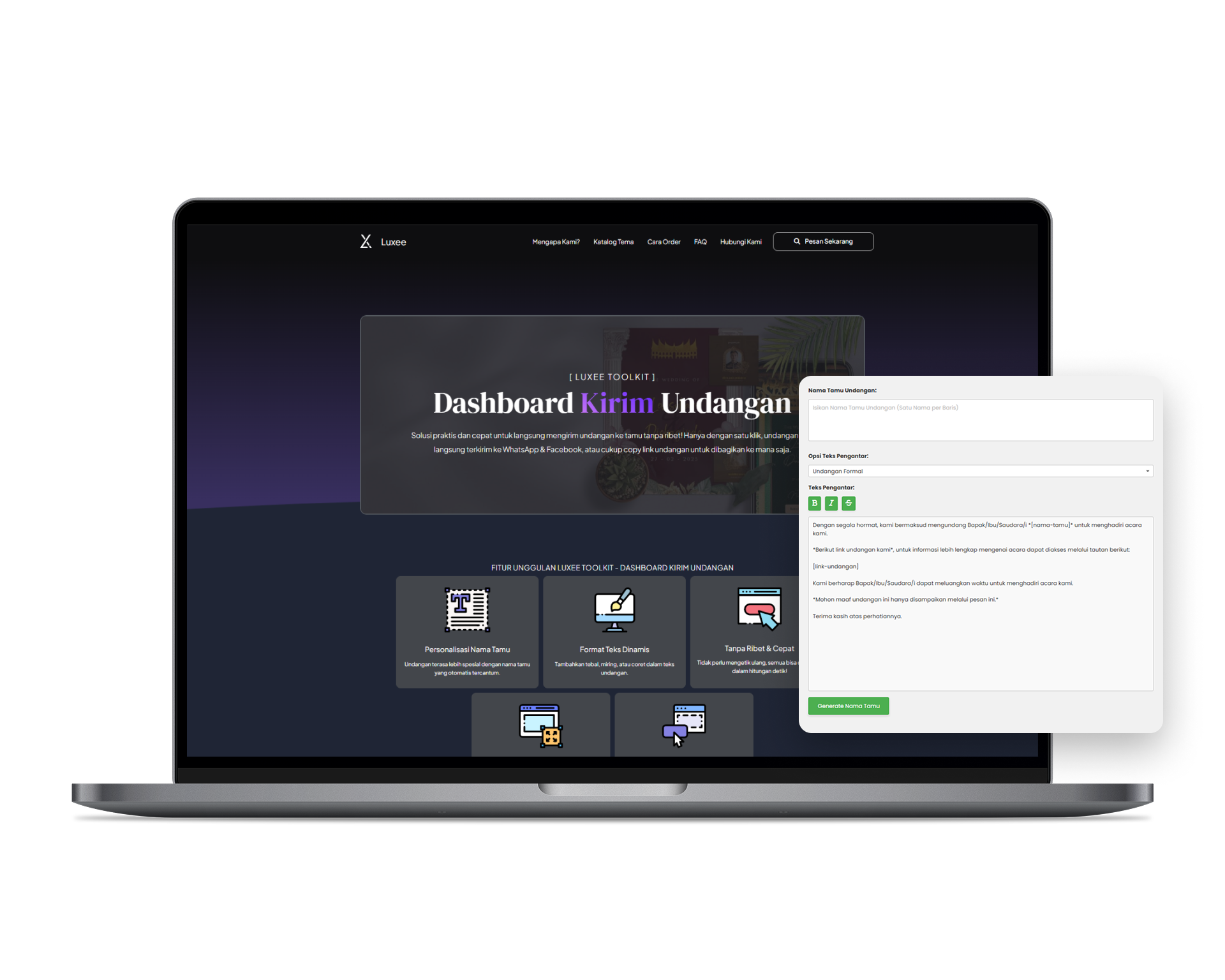 Solusi praktis dan cepat untuk langsung mengirim undangan ke tamu tanpa ribet! Hanya dengan satu klik, undangan bisa langsung terkirim ke WhatsApp & Facebook, atau cukup copy link undangan untuk dibagikan ke mana saja.