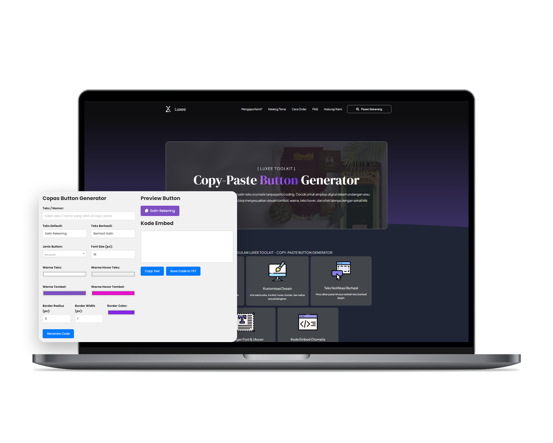 Aalat praktis untuk membuat tombol salin teks otomatis tanpa perlu coding. Cocok untuk amplop digital dalam undangan atau tombol salin cepat di website. Anda bisa menyesuaikan desain tombol, warna, teks hover, dan efek lainnya dengan sekali klik.