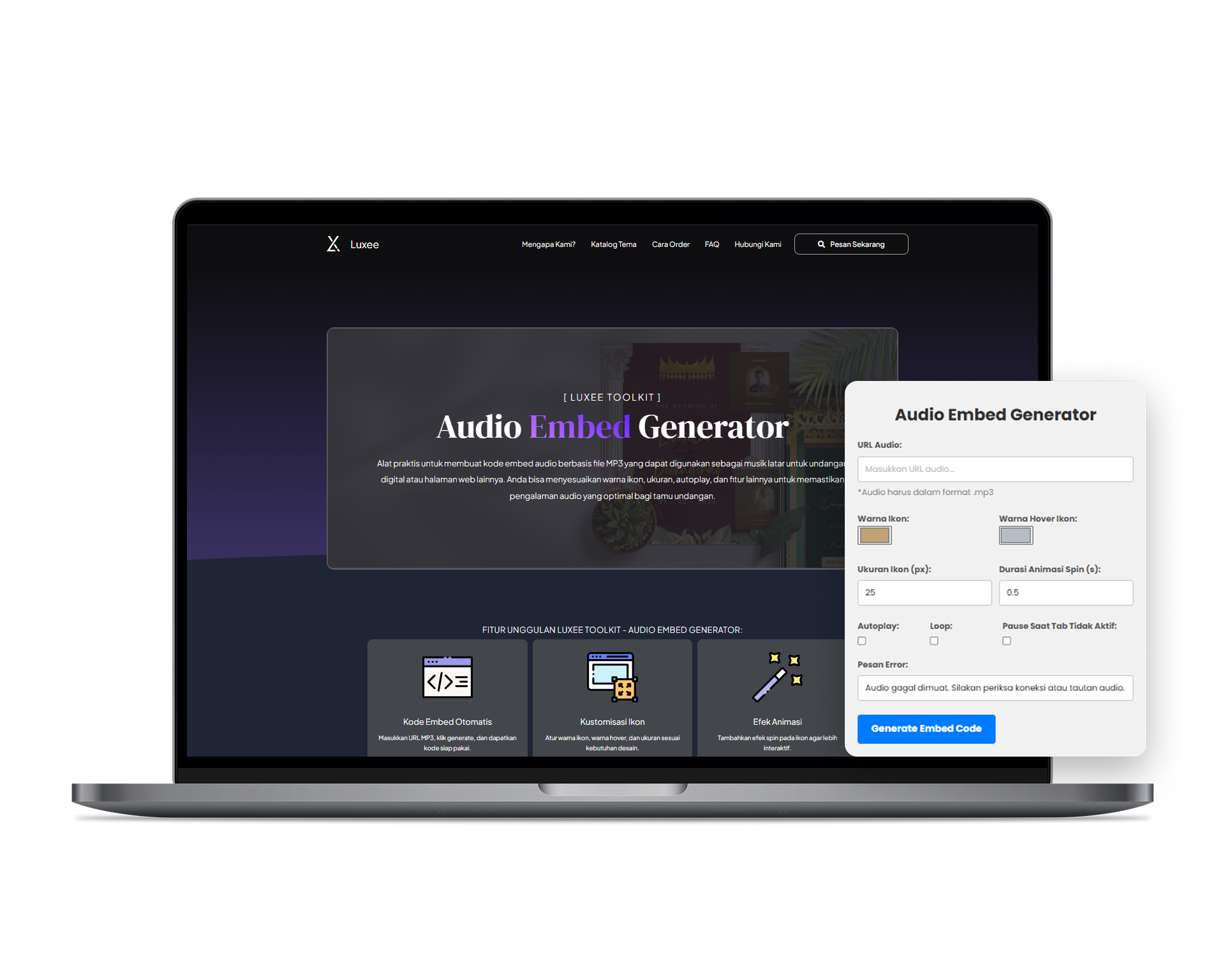 Luxee menyediakan script HTML khusus dan form generator kode audio untuk membantu pengguna menyisipkan musik secara otomatis di halaman undangan digital.