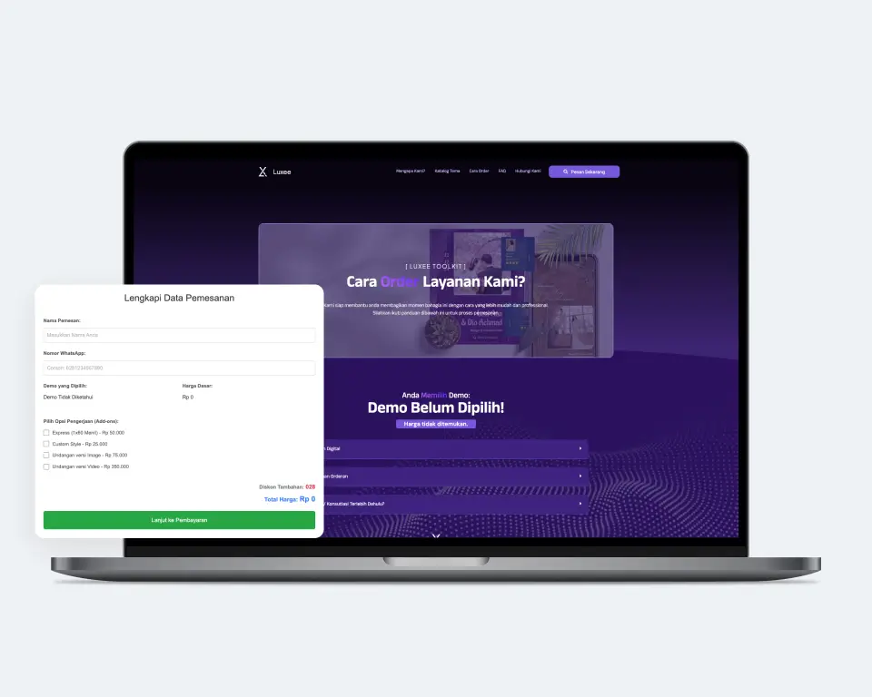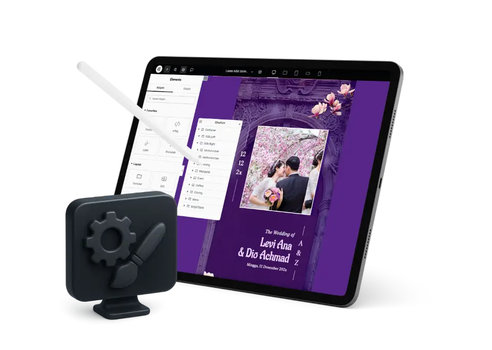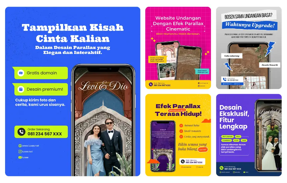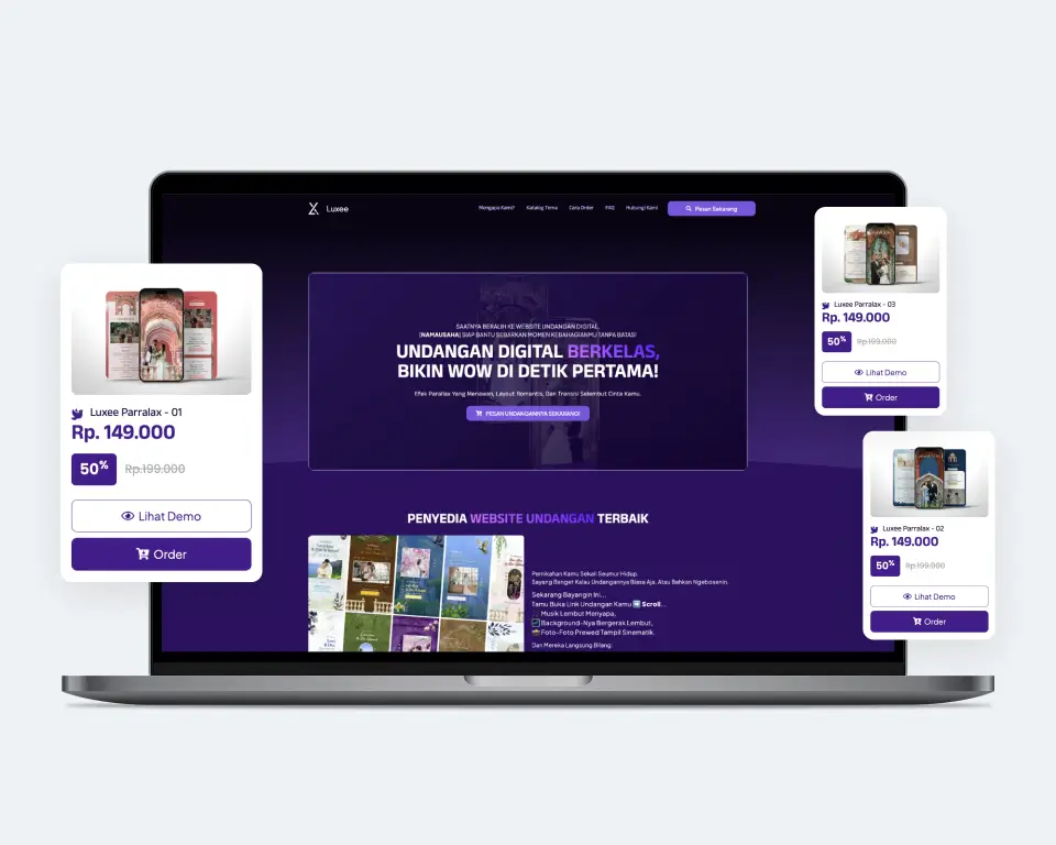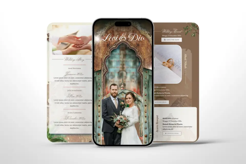Luxee menghadirkan template undangan digital pernikahan dengan efek parallax yang memukau, menggabungkan keindahan visual, transisi halus, dan layout yang romantis. Cocok untuk kamu yang ingin memberikan kesan berkelas, modern, dan personal dalam undangan pernikahan.