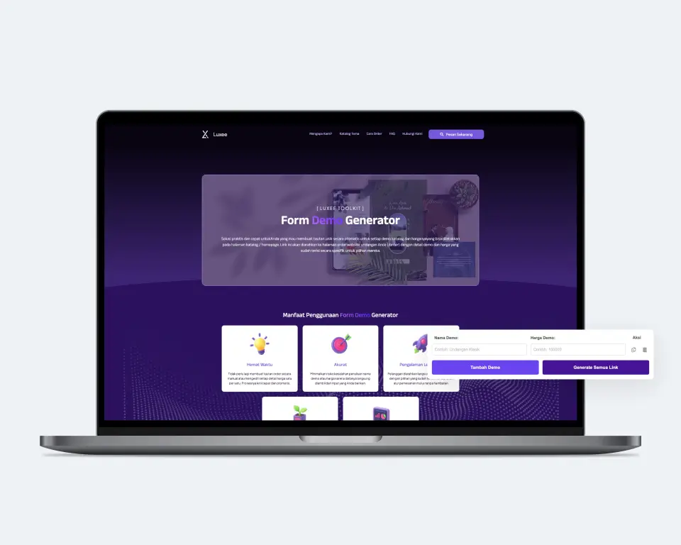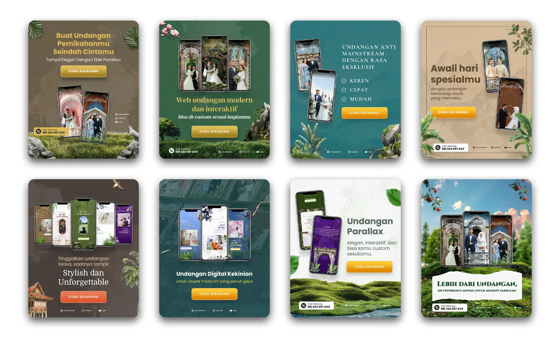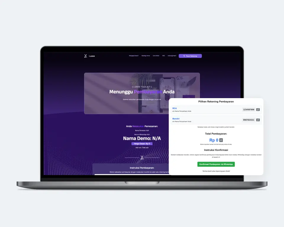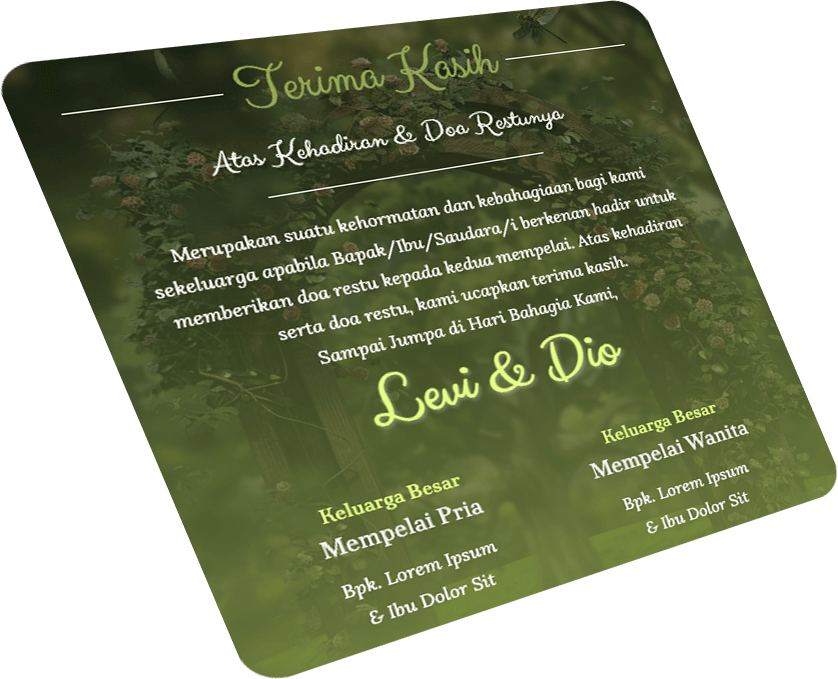 Luxee menghadirkan template undangan digital pernikahan dengan efek parallax yang memukau, menggabungkan keindahan visual, transisi halus, dan layout yang romantis. Cocok untuk kamu yang ingin memberikan kesan berkelas, modern, dan personal dalam undangan pernikahan.