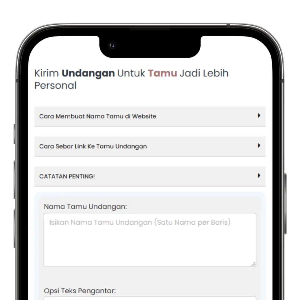 Anda bebas menambahkan nama tamu yang akan diundang sebanyak-banyaknya agar undangan yang dikirimkan jadi lebih personal tanpa ada batasan pengiriman / generate tamu undangan.