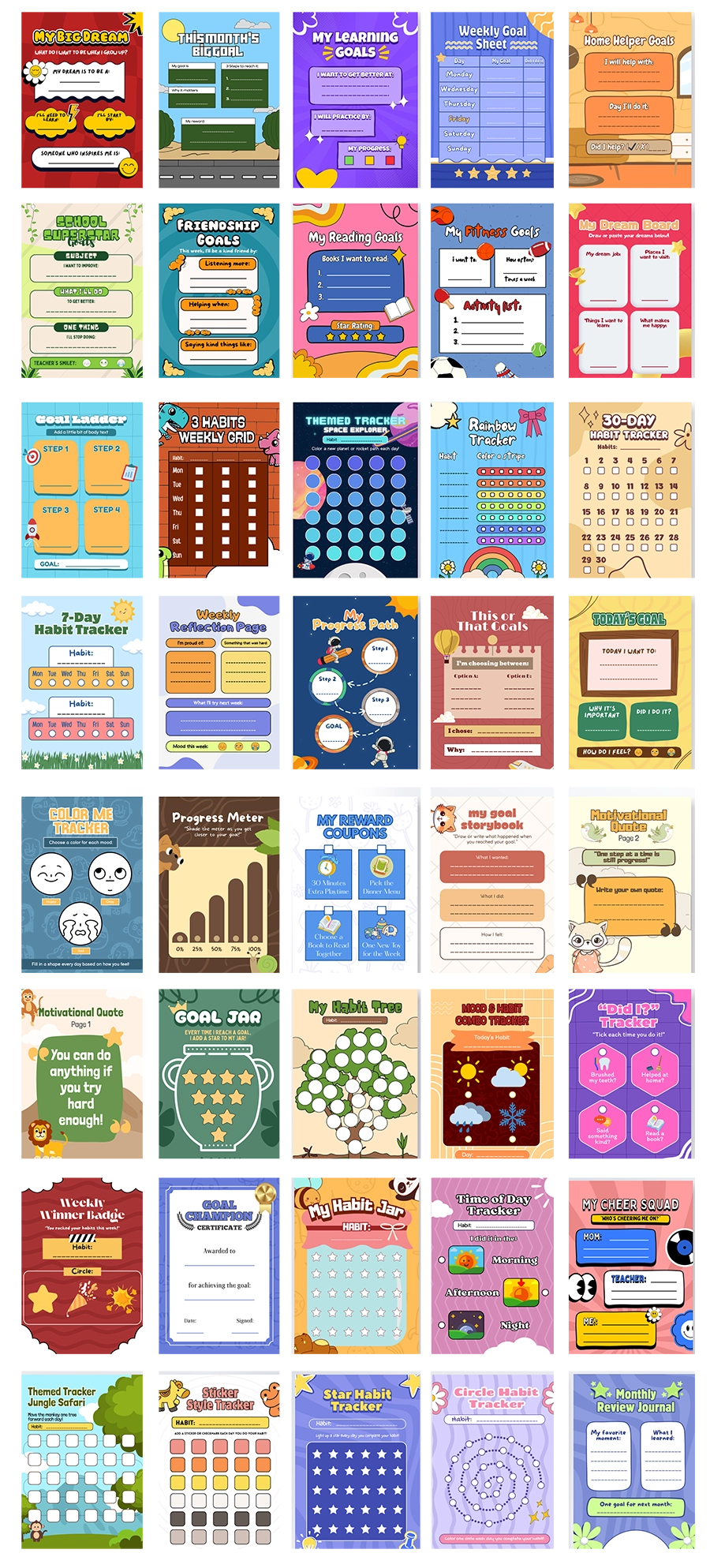 40 templates to encourage kids to set goals and track habits in a fun and visual way.