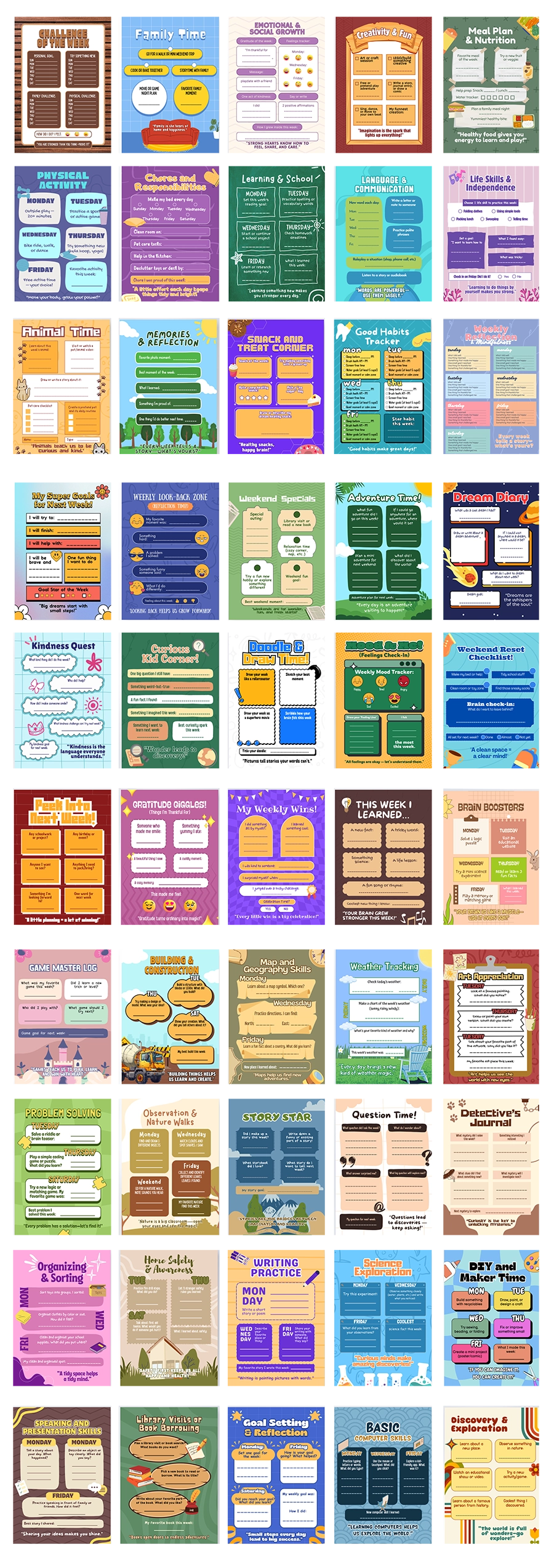 50 templates to help kids plan their entire week with easy-to-use designs.