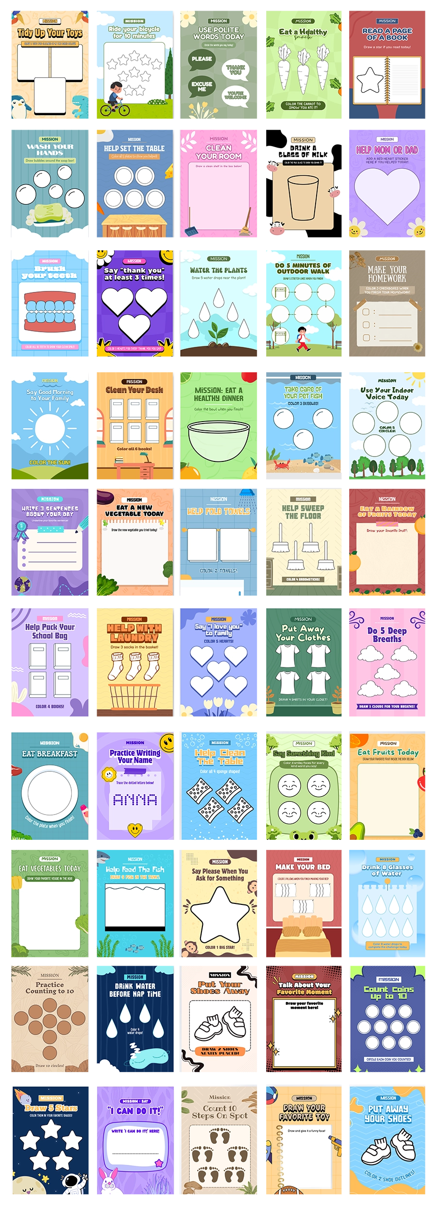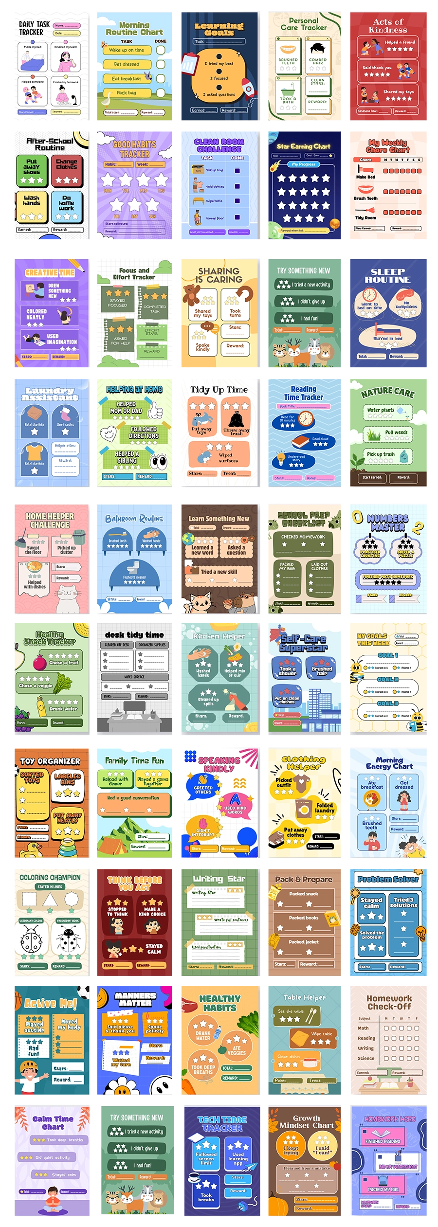 50 colorful charts to help kids keep track of their responsibilities and tasks.