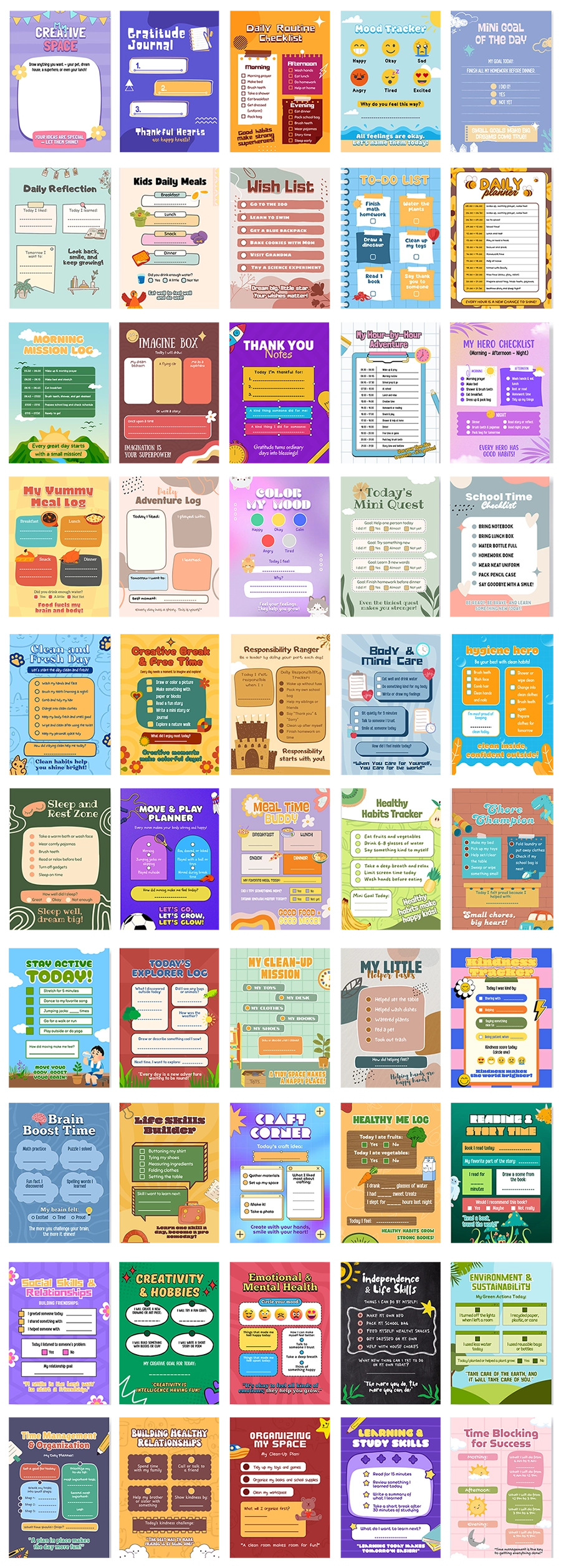 50 beautifully designed daily planner pages to help kids organize their day with fun layouts.