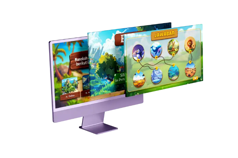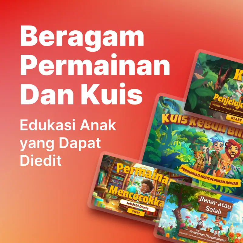 Bundling game dan kuis anak yang unik, lengkap dengan pengisi suara dan mudah disesuaikan menggunakan powerpoint.