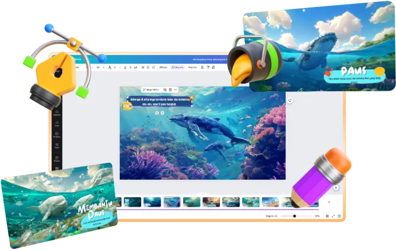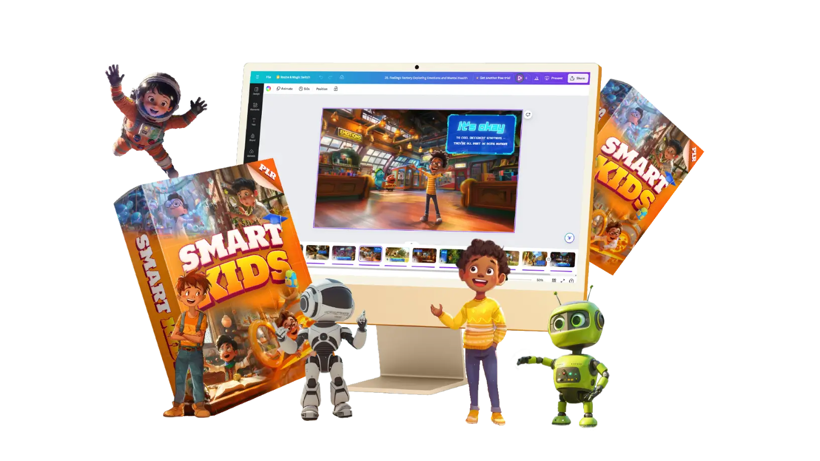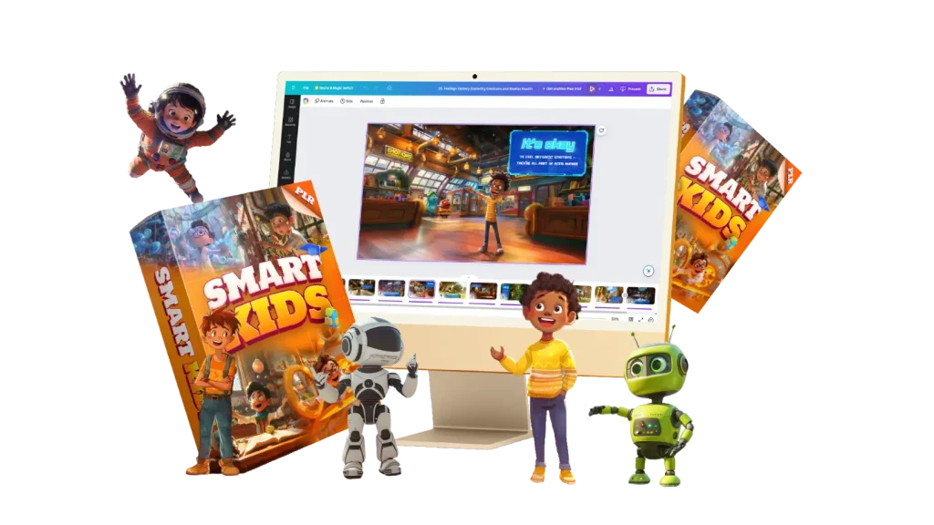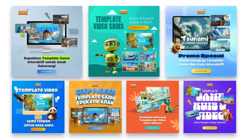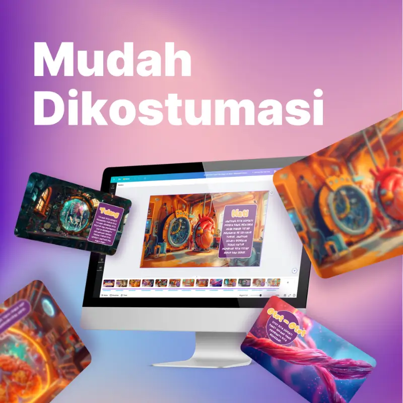 SmartKids adalah template Canva yang dapat dibeli dan digunakan oleh siapa saja. SmartKids berisi ilustrasi gambar dengan teks, audio, atau narasi yang dapat diubah. Jika Anda ingin berbeda dari yang lain, Anda harus mengganti semua aset di dalamnya dan membuat desain ilustrasi Anda sendiri. Sebagai pelengkap, tersedia tutorial untuk menyesuaikan dengan ilustrasi Anda sendiri.