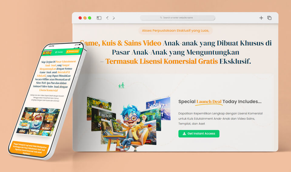 Sekarang, anda bisa mendapat keuntungan dari pasar edutainment anak yang menguntungkan dengan game interaktif, kuis, dan video sains anak yang sudah siap pakai dan dapat diedit, lengkap dengan animasi dan pengisi suara, semuanya dengan lisensi PLR eksklusif.