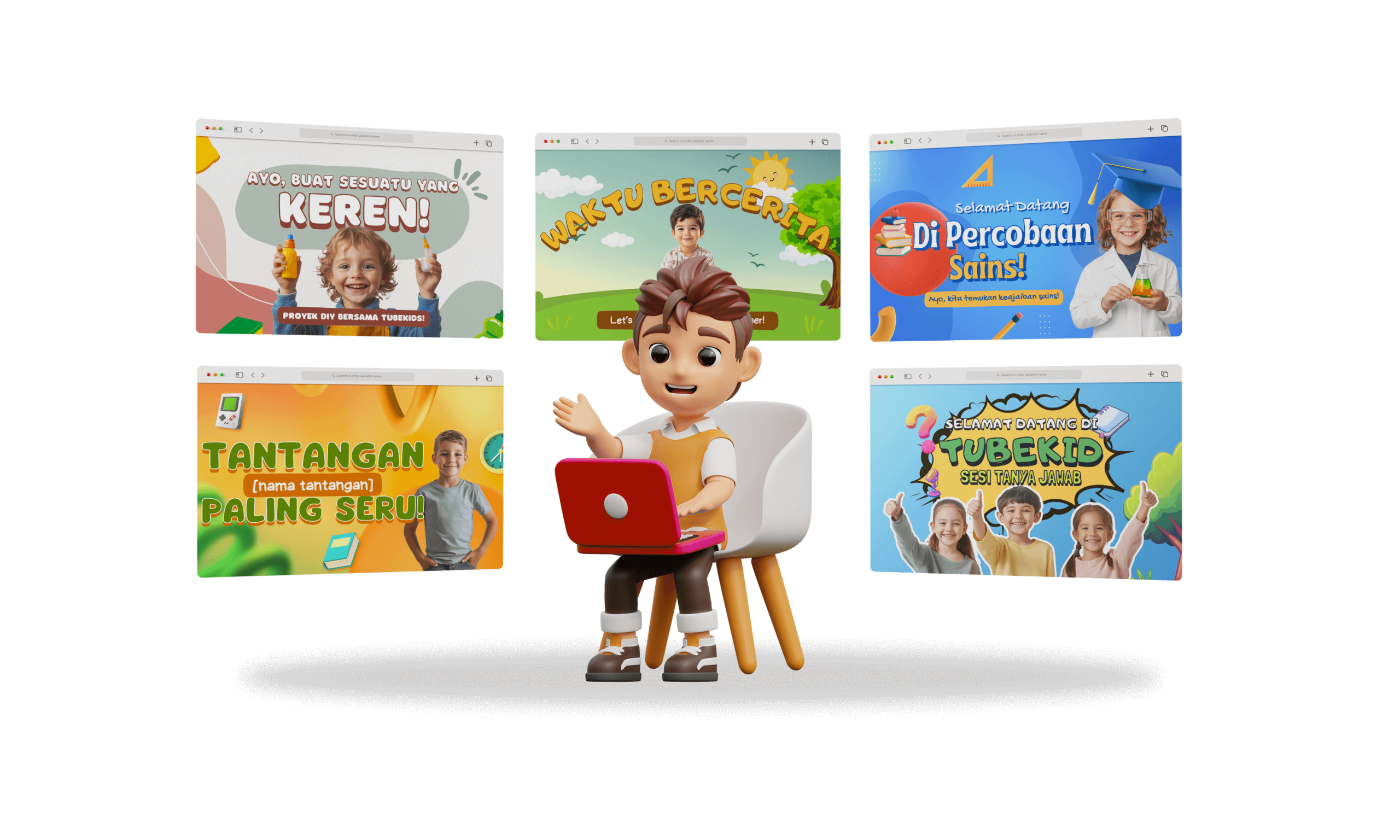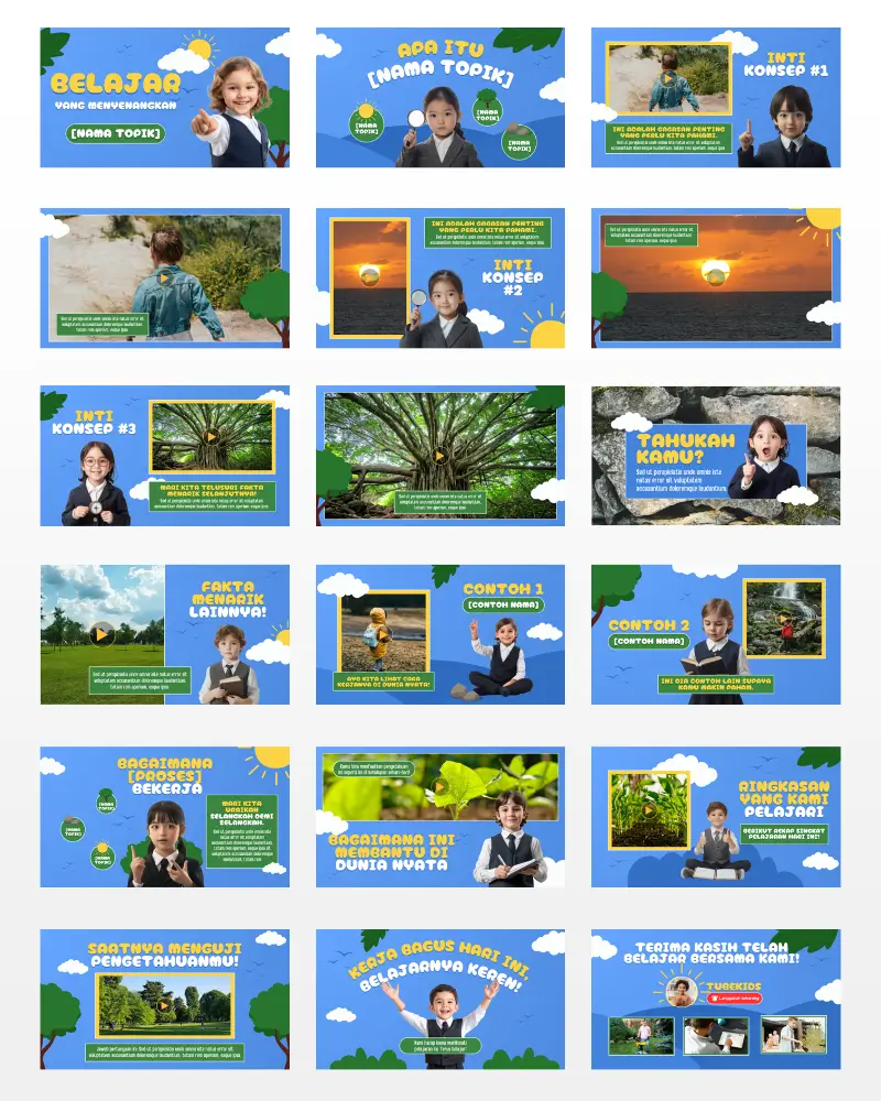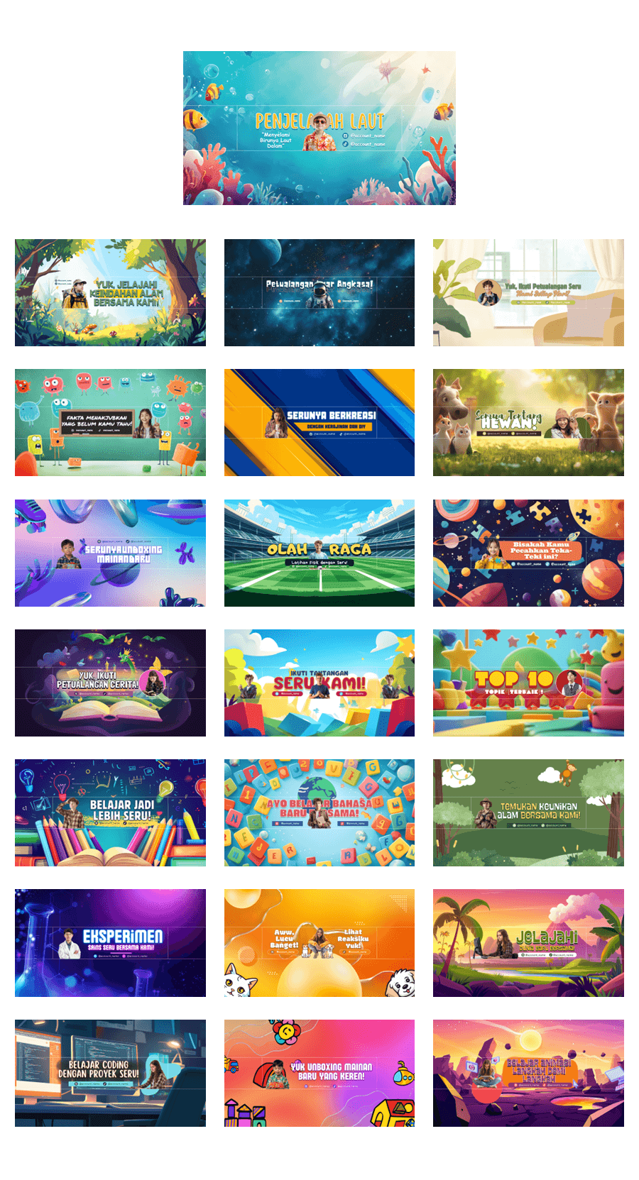 YouTube gudangnya konten anak-anak, jutaan anak nonton tiap hari. Sekarang, kamu bisa bikin channel YouTube Anak pakai aset kami, sudah disiapkan dan gampang banget diedit !