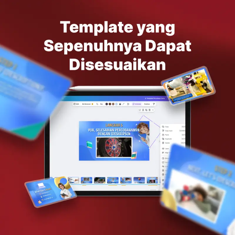 Kustomisasi template dan aset dengan branding kamu pakai tool editing yang gampang—gak perlu skill canggih. Tambahin nama kamu, utak-atik desainnya, dan bikin jadi milikmu sendiri.